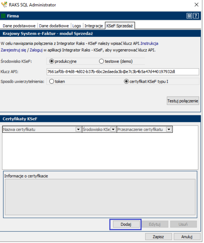 1. Następnie w tym samym oknie (zakładka KSeF Sprzedaż) dodaj certyfikaty typu I i II wygenerowane dla Twojej firmy. Sekcja Certyfikaty KSeF – Dodaj.