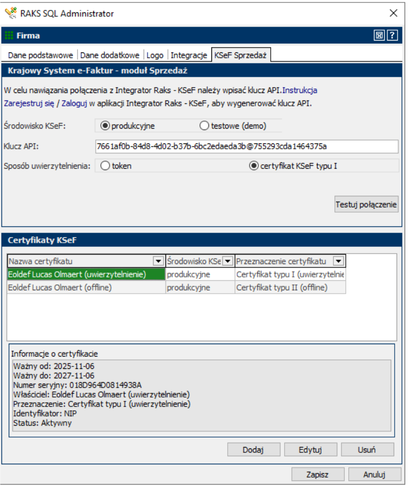 Certyfikaty wystawione na identyfikator NIP firmy dodajemy w Administrator- Firma – KSeF Sprzedaż- Certyfikaty KSeF.