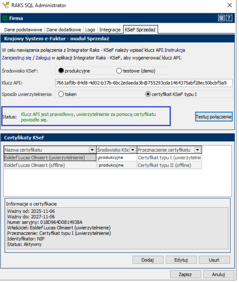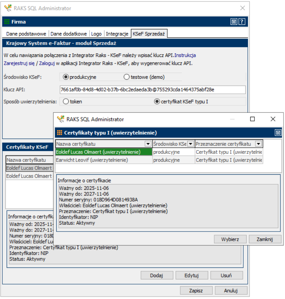 Po dodaniu certyfikatów są one widoczne w oknie: Certyfikaty KSeF.