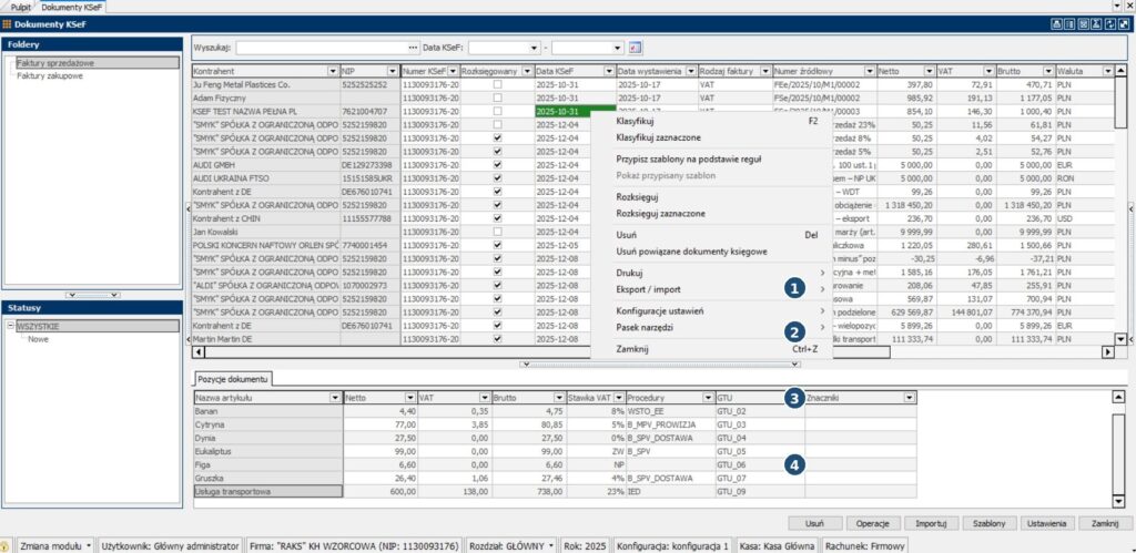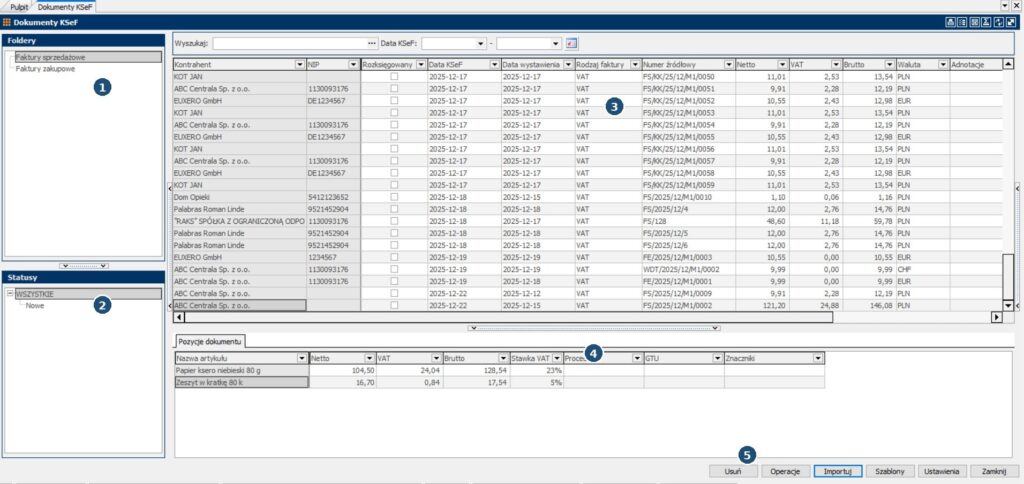 - 3 – „Lista dokumentów” – lista faktur pobranych z Inegratora KSeF (kolumny z danymi m.in. Kontrahent, Numer KSeF, Data KSeF, Netto/VAT/Brutto).