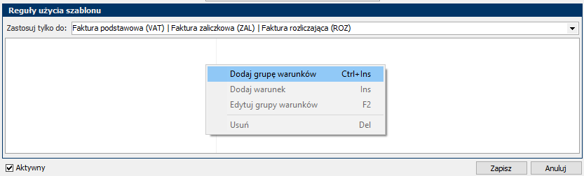 - W sekcji „Reguły użycia szablonu” ustaw warunki automatycznego wyboru.