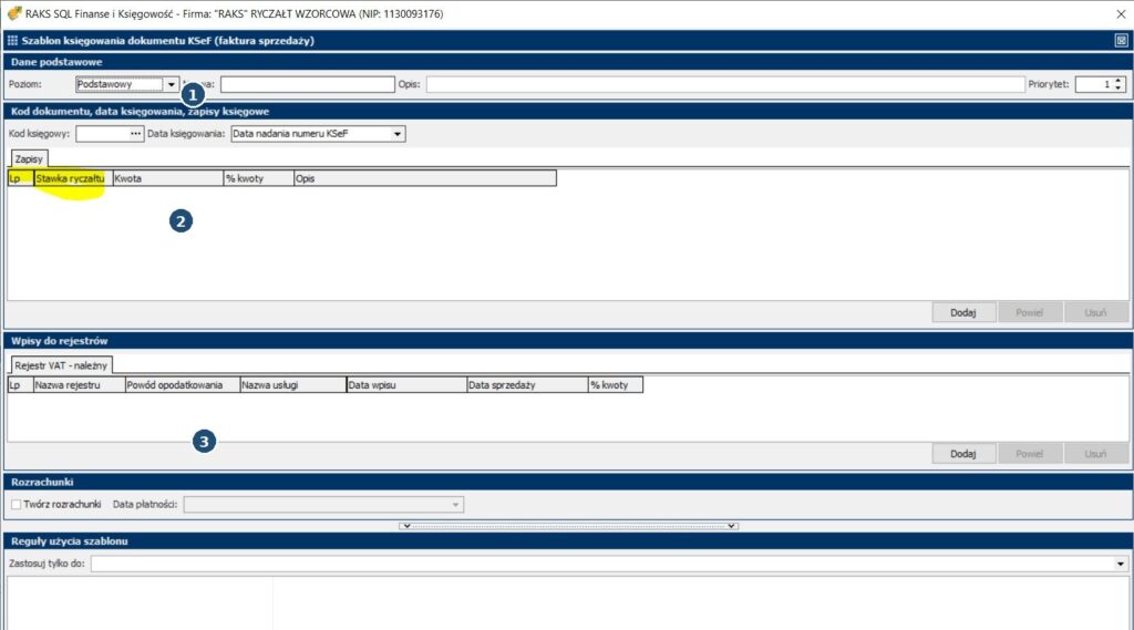 - W sekcji „Zapisy” ustaw właściwą „stawkę ryczałtu” oraz sposób podziału kwoty (jeśli używasz procentów).