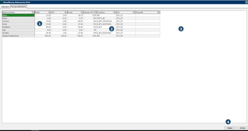 - „Zapisz” – zatwierdź klasyfikację pozycji dokumentu.