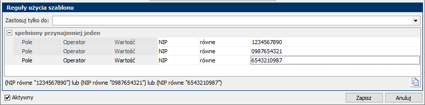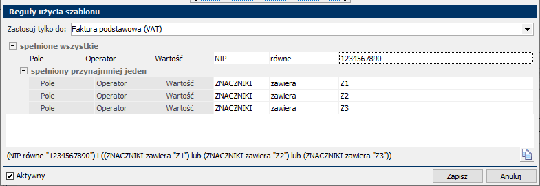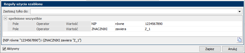 - Opcjonalnie uzupełnij Reguły użycia szablonu (aby ograniczyć stosowanie), a następnie kliknij Zapisz. Przetestuj na 1 dokumencie.
