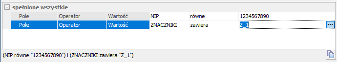 - Warunki (spełnione wszystkie): ZNACZNIKI zawiera PALIWO_50 oraz ZNACZNIKI zawiera WIELOPOZYCYJNA.
