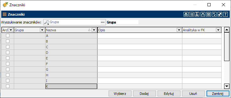 - Pozycje bez znacznika (Sposób: Brak znaczników): 401-0006 – 100% „Kwota netto”; 221 – 100% „Kwota VAT”.