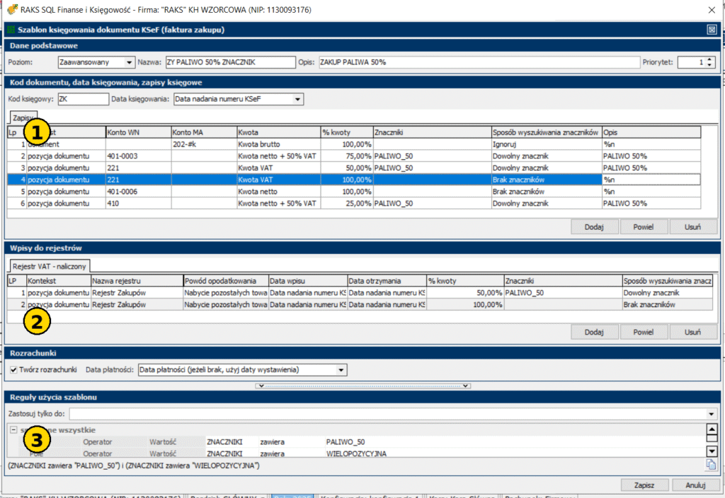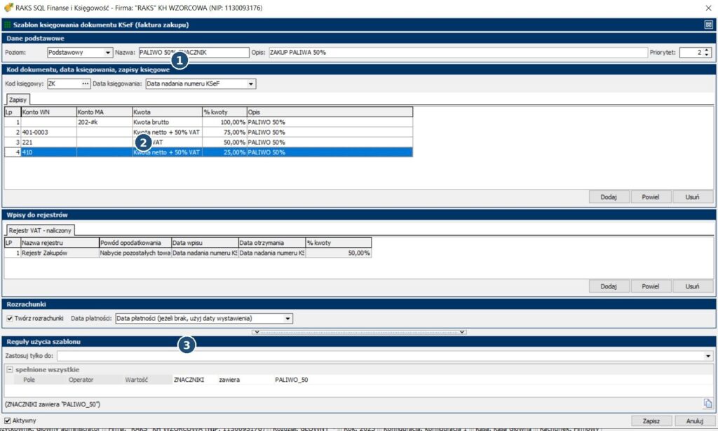 - Dla pozycji z PALIWO_50 ustaw „% kwoty” = 50% (odliczenie VAT 50%).