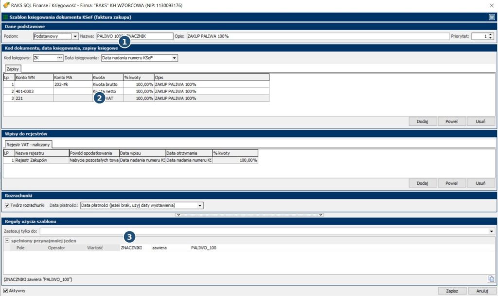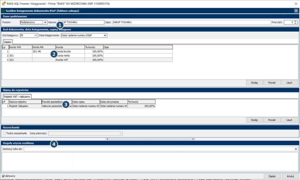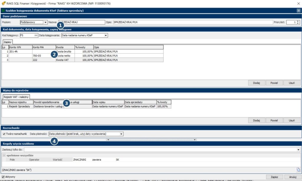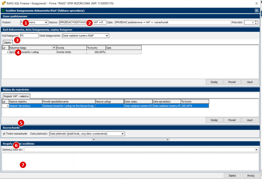 - Nazwa szablonu: rekomendacja, aby w nazwie wskazać wariant księgowania (np. „+ VAT + R” = z rejestrem VAT i rozrachunkami).