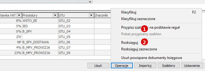- Wybierz „Operacje → Przypisz szablony na podstawie reguł” – program dobierze szablony wg reguł.