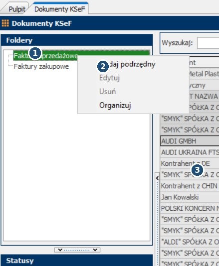 - 1 – „Foldery” – kategoria porządkująca dokumenty (np. Faktury sprzedażowe / Faktury zakupowe).