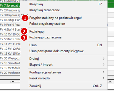 - 3 – „Rozksięguj zaznaczone” (zbiorczo dla zaznaczonych dokumentów).
