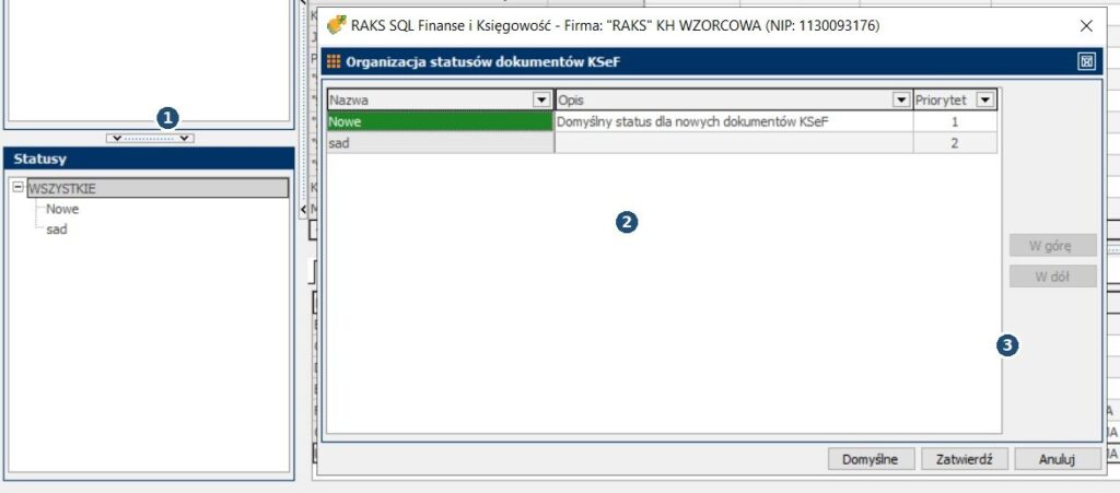 - 2 – „Statusy” – etap obsługi dokumentu (np. Nowe, W trakcie, Zaksięgowane – zależnie od konfiguracji).
