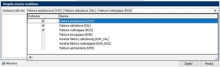- „Przypisz szablony na podstawie reguł” – automatyczny dobór szablonu wg „Reguł użycia szablonu”.